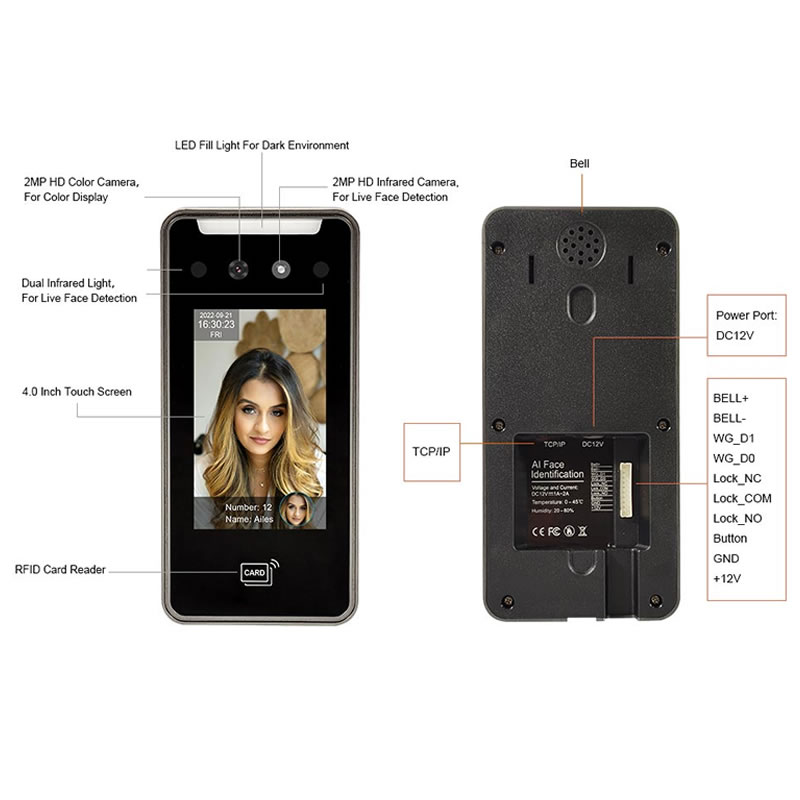 - • Supports Face Recognition, Fingerprint Reader, RFID Card